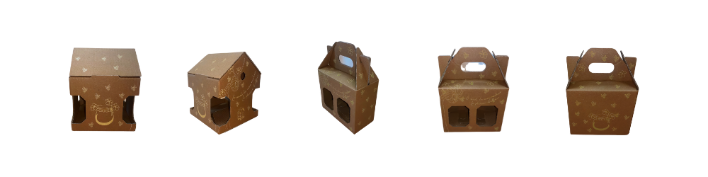 Boîte ruche pour 4 pots de miel : Un design original en forme de ruche, idéal pour des coffrets cadeaux ou la vente au détail.