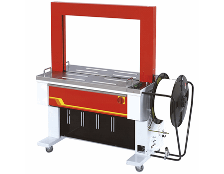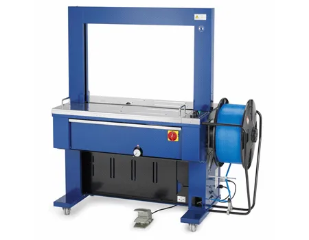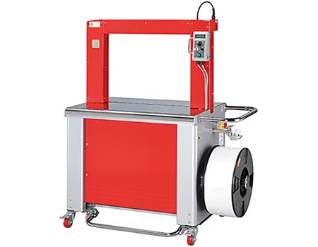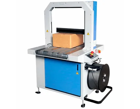 La TP702B, machine tout automatique équipée d’un convoyeur à bande afin d’assurer le transport et le cerclage de colis jusqu’à 40 cycles/minute.