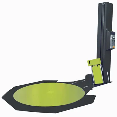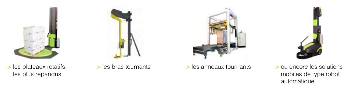 ● Les plateaux tournants ou rotatifs : les plus répandus sur le marché et polyvalents. Ils se composent d’une structure mécano-soudée avec un table tournante, d’un système d’engrenage et d’une colonne avec le chariot du porte-bobine de film sous forme de rouleau, géré par carte électronique.