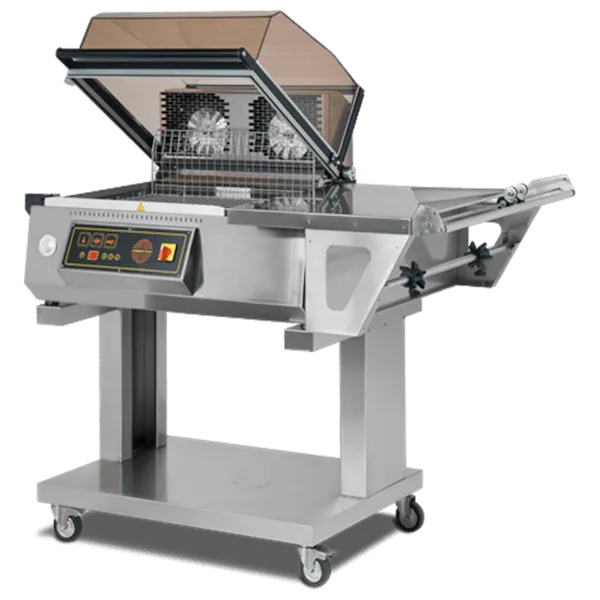 Elle utilise un film dosé (film en rouleau avec un côté ouvert) en PE ou POF. Selon l’application, le film peut être rétracté à chaud grâce à une cloche ou un tunnel de rétraction.