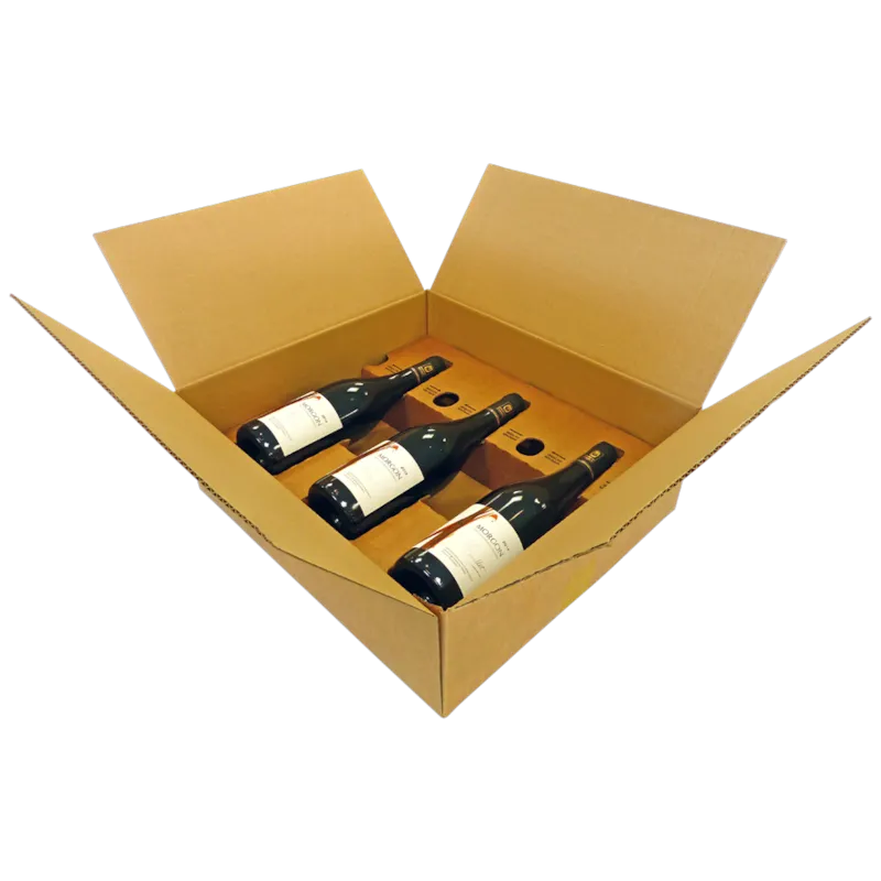 Boîte carton adaptée à l’envoi postal de 3 bouteilles de vin ou champagne, elle est constituée d’une caisse et de 6 demi-coques (vendues séparément).