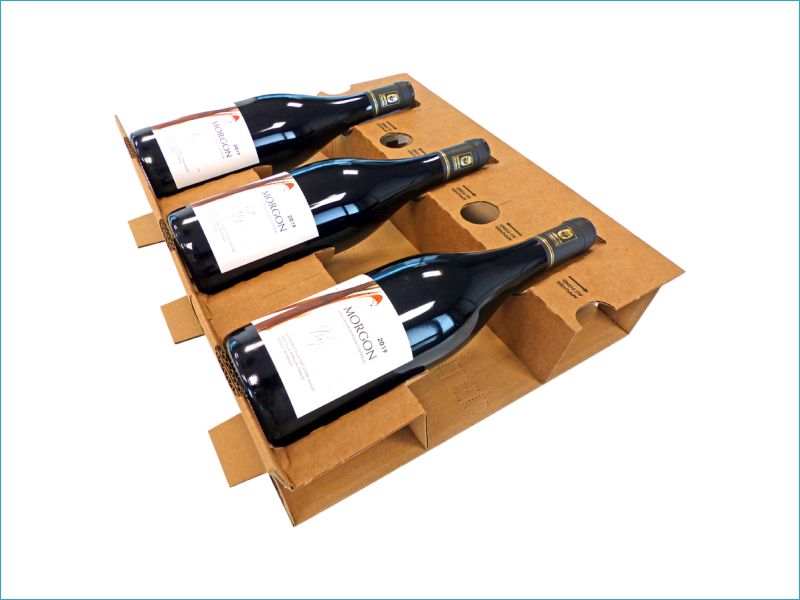 Boîte carton adaptée à l’envoi postal de 3 bouteilles de vin ou champagne, elle est constituée d’une caisse et de 6 demi-coques (vendues séparément).