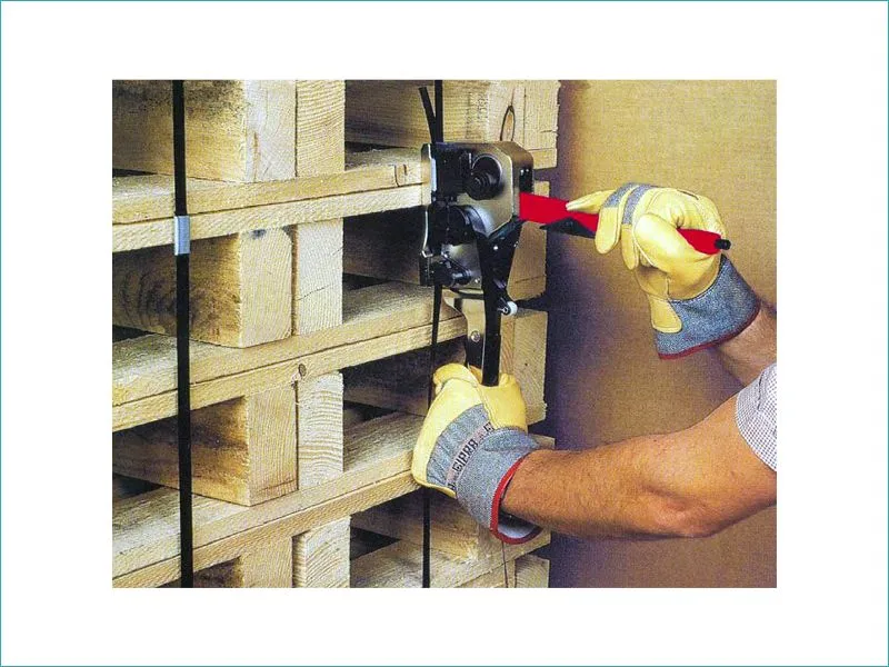 Il s’utilise avec du feuillard polypropylène ou polyester, et des chapes en acier haute résistance à picots.