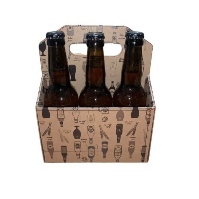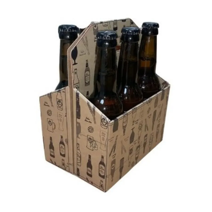 Le panier 6 bouteilles en carton kraft 19,5 x 13,5 x 23,5 cm est conçu pour accueillir 6 bières de 33 cl. Il est également disponible en carton blanc, offrant une alternative originale et pratique pour la vente directe. Le panier 6 bouteilles blanc est une solution élégante et fonctionnelle pour commercialiser vos bières. Fabriqué en carton ondulé avec une cannelure E20, ce panier garantit à la fois robustesse et esthétique. Son design pratique permet un transport facile tout en mettant en valeur vos bouteilles.
