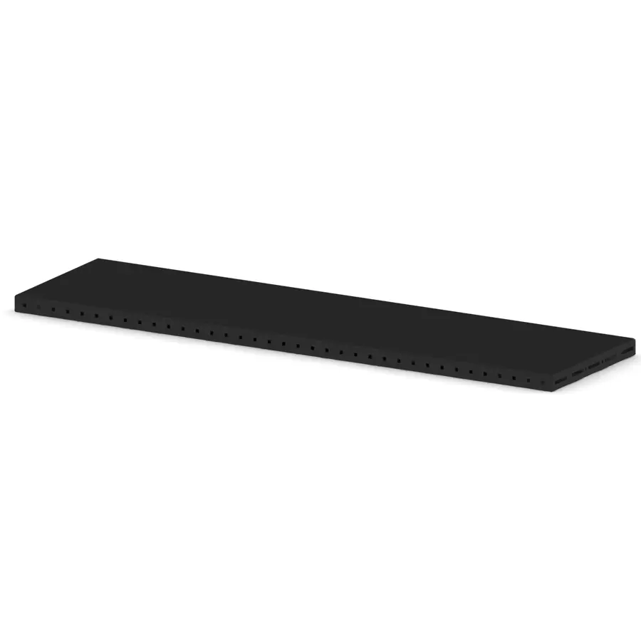 Peut supporter une charge de 100 Kg. Perforations sur la périphérie tous les 40 mm pour l’installation d’accessoires. Position réglable sur la profondeur. Convient en tant qu’étagère supérieure. Peinture poudre époxy haute résistance gris foncé RAL 7021.A compléter avec les montants pour étagère (non fournis).