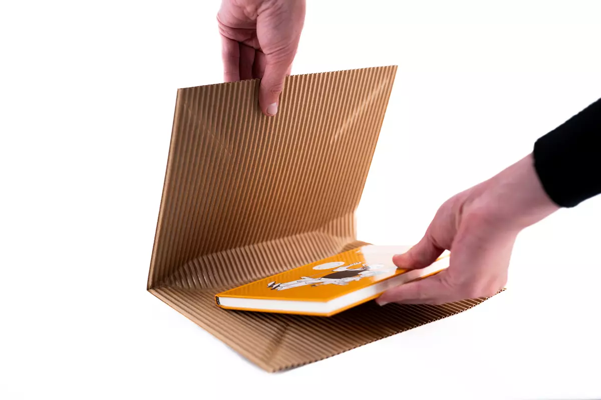 Sa structure en carton ondulé auto-scellant garantit une résistance élevée et une fermeture inviolable sans ruban, ni film plastique.