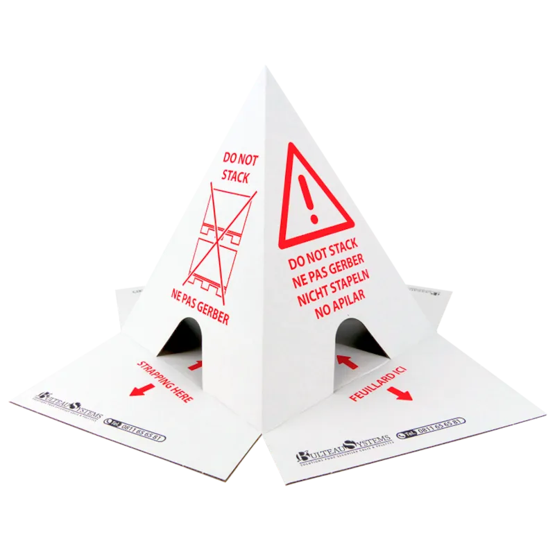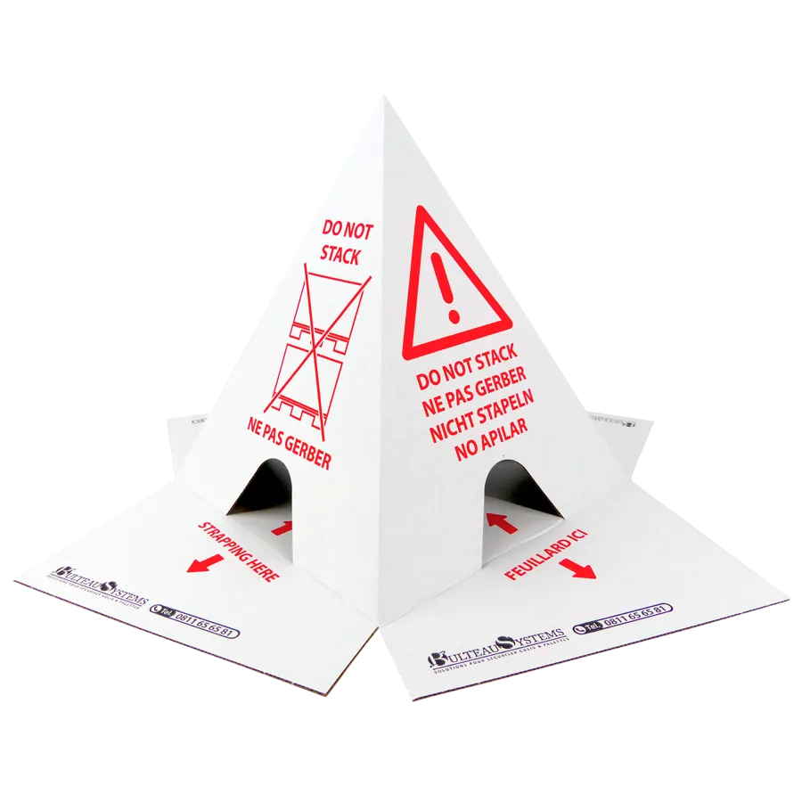 Fabriqué en carton brun micro-cannelure. Les cônes anti-gerbage de dimensions spécifiées sont dotés de deux bandes adhésives et 4 fentes pour fixation supplémentaire avec un feuillard de cerclage. Fabriqués à partir de carton micro-cannelure recyclable, leur montage est simple et rapide. Elles offrent une signalétique indispensable et facilement accessible avec quatre langues et des visuels simples à comprendre.