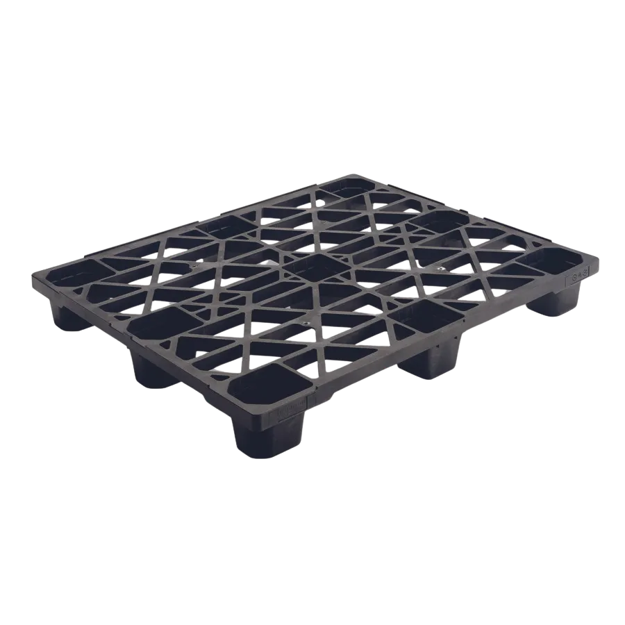 Cette palette ergonomique et emboîtable a 9 plots est disponible en version plateau ajouré. Elle est durable et convient pour