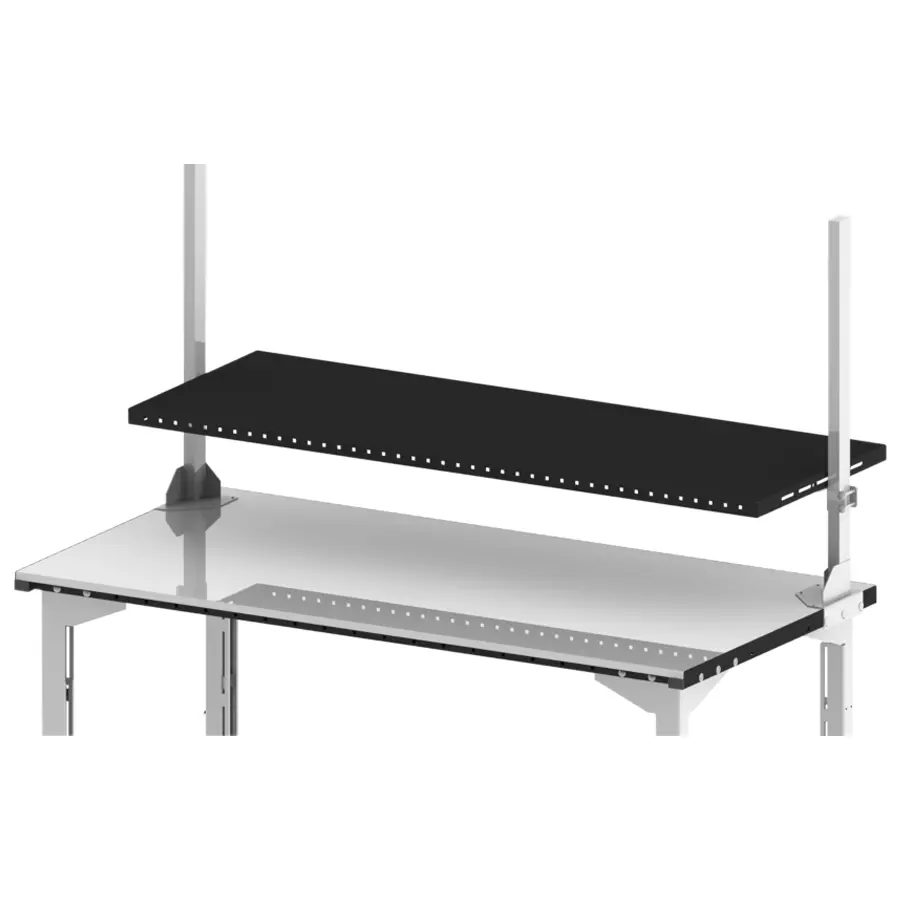 Peut supporter une charge de 100 Kg. Perforations sur la périphérie tous les 40 mm pour l’installation d’accessoires. Position réglable sur la profondeur. Convient en tant qu’étagère supérieure. Peinture poudre époxy haute résistance gris foncé RAL 7021.A compléter avec les montants pour étagère (non fournis).