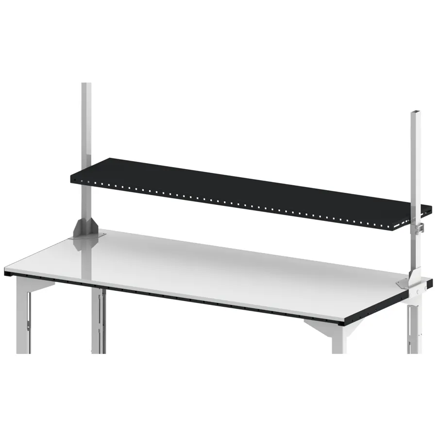 Peut supporter une charge de 100 Kg. Perforations sur la périphérie tous les 40 mm pour l’installation d’accessoires. Position réglable sur la profondeur. Convient en tant qu’étagère supérieure. Peinture poudre époxy haute résistance gris foncé RAL 7021.A compléter avec les montants pour étagère (non fournis). Cette étagère haute de 40 cm de profondeur, conçue pour s'adapter aux tables de 200 x 90 cm, est l'alliée parfaite pour optimiser les espaces de préparation de commandes. Sa robustesse lui permet de supporter jusqu'à 100 kg, contribuant ainsi à une meilleure organisation des outils et produits. Elle favorise une ergonomie accrue, réduisant le risque de TMS en minimisant les mouvements superflus. Modulable et résistante, cette solution fabriquée en France s'intègre harmonieusement avec les étagères mesurant 189,5 cm.