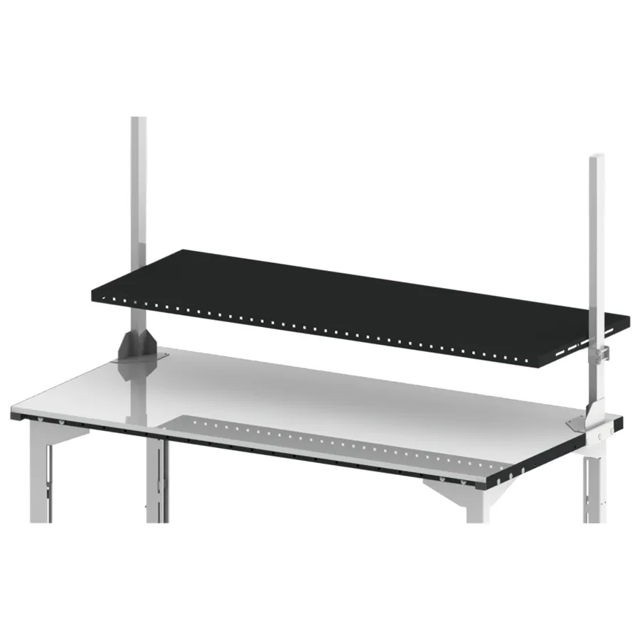 Peut supporter une charge de 100 Kg. Perforations sur la périphérie tous les 40 mm pour l’installation d’accessoires. Position réglable sur la profondeur. Convient en tant qu’étagère supérieure. Peinture poudre époxy haute résistance gris foncé RAL 7021.A compléter avec les montants pour étagère (non fournis). Cette étagère haute de profondeur 60 cm, conçue pour s'adapter à une table de 200 x 90 cm, optimise l'espace et la fonctionnalité des postes de préparation de commandes. Sa robustesse lui permet de supporter jusqu'à 100 kg, contribuant ainsi à une meilleure organisation du travail. Elle favorise une ergonomie accrue, réduisant le risque de TMS par la minimisation des mouvements superflus. Modulable et résistante, cette solution "Made in France" s'intègre parfaitement avec les étagères existantes de 189,5 cm.