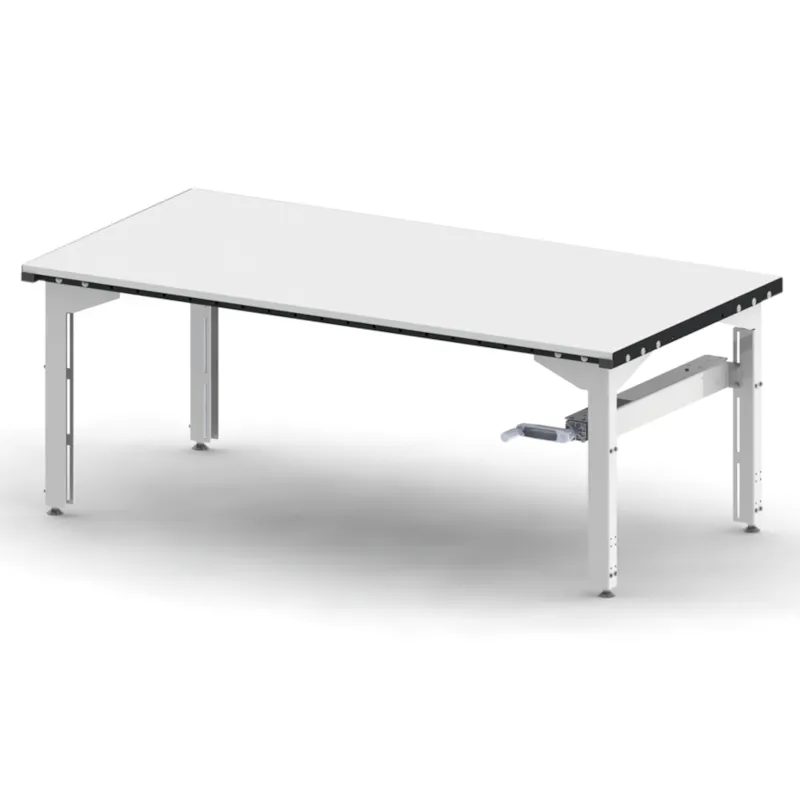 La large gamme de dimensions de tables et la multitude d’accessoires proposés permettent de nombreuses combinaisons de configuration. Grâce au réglage en hauteur des tables par vis d’arrêt, manivelle ou moyen électrique et la modularité de chaque accessoire on améliore grandement la satisfaction et la santé des employés, mais aussi leur productivité. Cette table de préparation ergonomique est conçue pour améliorer le confort des manutentionnaires et prévenir les TMS. Dotée de vérins hydrauliques avec manivelle, elle permet un réglage précis de la hauteur (70-110 cm) pour s'adapter à chaque utilisateur. Sa structure en acier mécano soudé garantit robustesse et une capacité de charge jusqu'à 300 kg sur le plateau en mélaminé blanc (130 x 90 cm). Le cadre périphérique, perforé tous les 80 mm, facilite l'ajout d'accessoires. Finition en peinture époxy gris foncé RAL 7021 et gris clair RAL 7047.