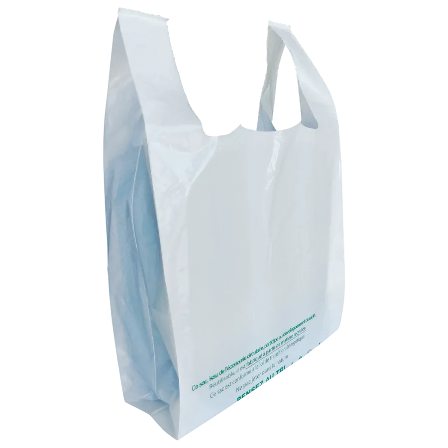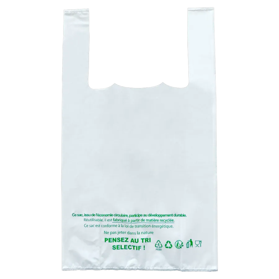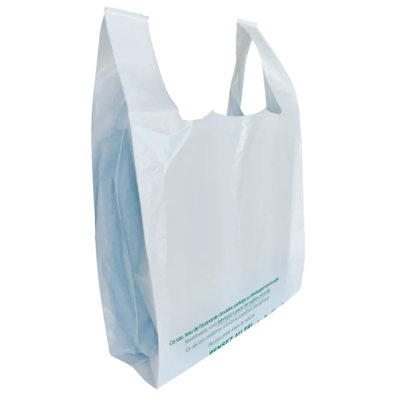 Réutilisable et résistant ! Fabriqué en plastique PEBD 50 microns, ce sac plastique à bretelles à des poignées et des soufflets latéraux pour faciliter le transport de vos produits. Optez pour notre sac plastique blanc à bretelles, conçu pour allier résistance et praticité. Fabriqué en PEBD 50µ, ce sac réutilisable et recyclable est conforme à la loi de transition énergétique. Ses dimensions de 26 x 45 cm, renforcées par des soufflets latéraux, facilitent le transport de vos achats. Apte au contact alimentaire, il intègre également les mentions légales et le code-barre. Un choix durable pour vos emplettes quotidiennes.