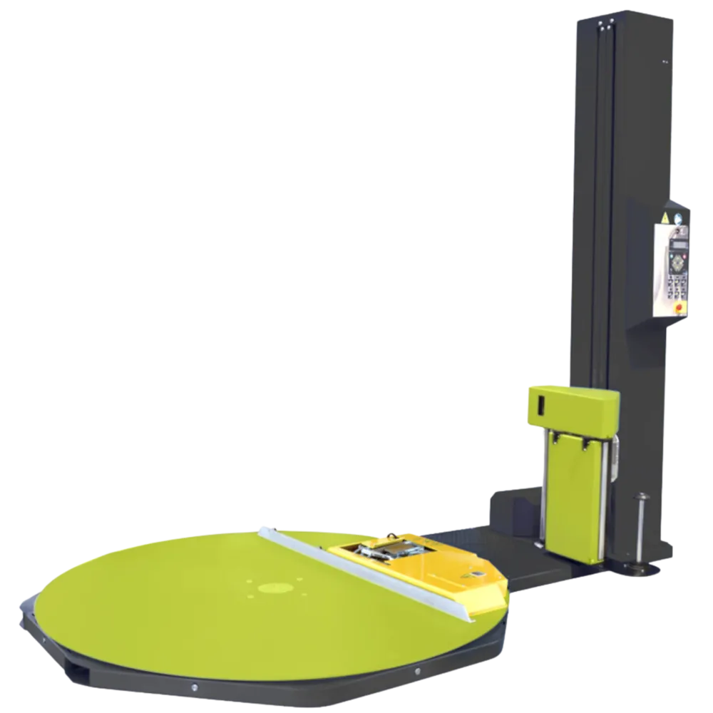 Plateau 1800 mm pour palettes 1000 x 1200 mm, Mât pour hauteur de banderolage 3000 mm, Télécommande, Plateau presseur, Protection périmètrique (grille, déport de coffret de commande, cellule anti-intrusion chariot...)