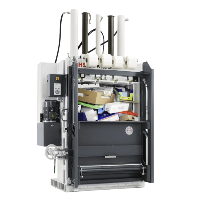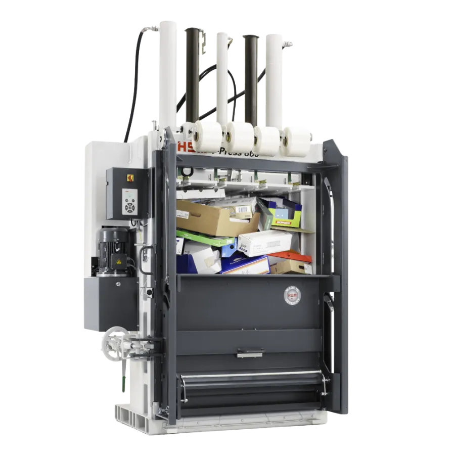 Optez pour la solution la plus experte de traitement de vos déchets pouvant faire des balles pesant jusqu'à 480 kg! La HSM V-Press 860 représente la solution économique et écologique pour vos tâches de traitement des déchets grâce à sa pression de compactage de 594 kN et sa technologie silencieuse et à faible consommation d‘énergie. Poids des balles en kg (selon matériau) jusqu’à 480. porte coulissante avec verrouillage par volant. Compactage économique de vos balles papier, cartons, et plastiques. Peut faire des balles pesant jusqu'à 60 kg. Les presses verticales conviennent parfaitement, de par leurs dimensions, leur coût et leurs caractéristiques, à l’industrie et au commerce. Ces presses à balles vous permettent de réduire le volume des matériaux d’emballage directement sur place jusqu’à 95 % de leur volume initial. Chargement idéal des poids lourds. Utilisation de récupération de chaleur dans la production. Les emballages peuvent devenir un problème. Si l’on considère le matériel