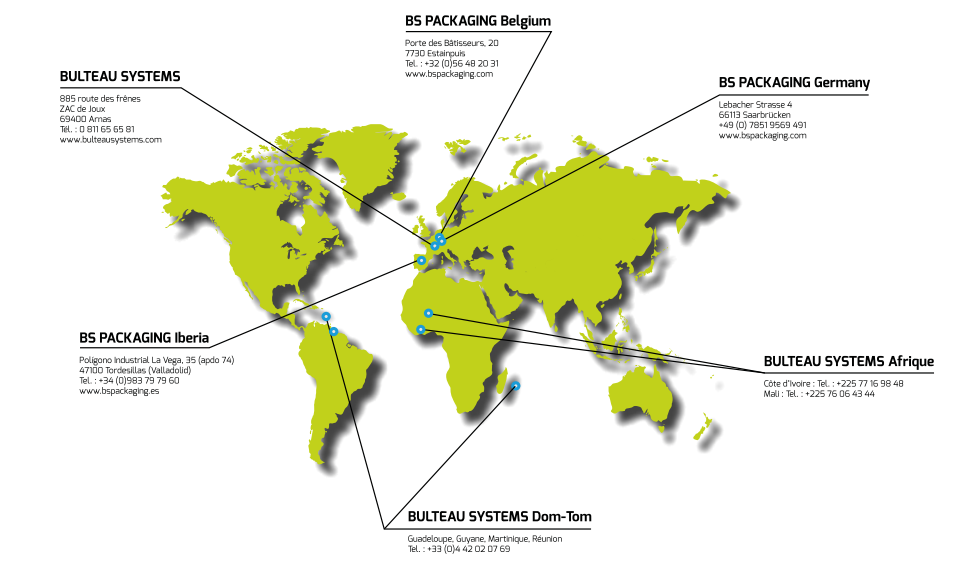 Bulteau Systems est en mesure de vous accompagner sur vos sites européens et africains grâce aux 5 agences BS Packaging et dépôts basés en Belgique, Espagne et Côte d’Ivoire. Notre agence Export Dom-Tom à Vitrolles assure le suivi de vos sites en territoire d'outre-mer.