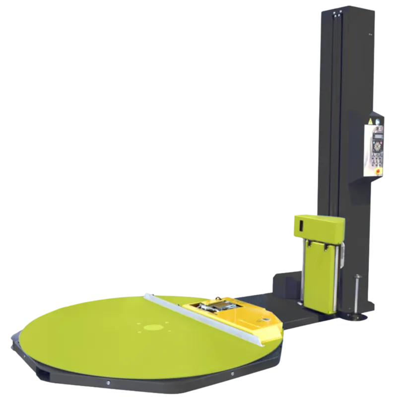 Plateau 1800 mm pour palettes 1000 x 1200 mm, Mât pour hauteur de banderolage 3000 mm, Télécommande, Plateau presseur, Protection périmètrique (grille, déport de coffret de commande, cellule anti-intrusion chariot...)