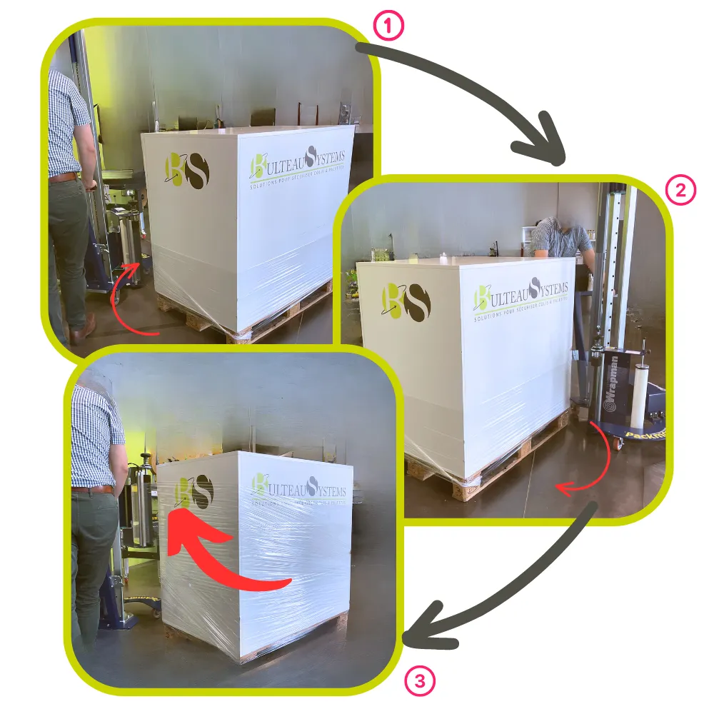 - Gain de place : Nécéssite que peu de place (600 mm) pour emballer vos palettes.