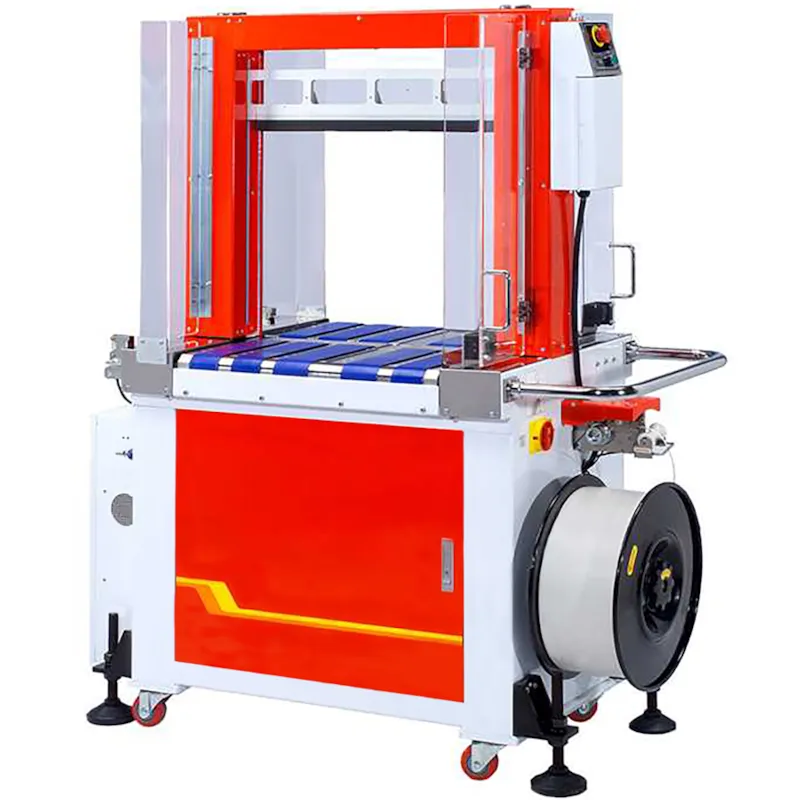 La machine à cercler TP702B est une cercleuse tout automatique à bandes motorisées qui peut être intégrée dans une ligne d’emballage.