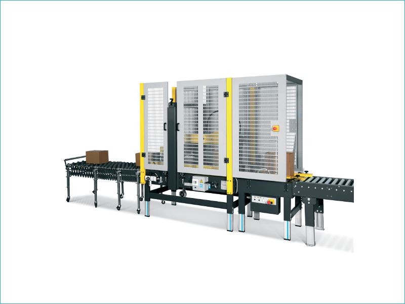 Un opérateur introduit manuellement les cartons et le processus de fermeture s’effectue automatiquement. Totalement réglable avec une manivelle située sur la partie haute de la machine, vous avez le choix de votre format de caisse avant l’opération en série. L’entraînement des cartons se fait par quatre bandes motorisées.